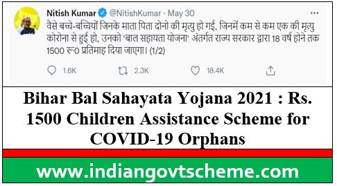 Bihar government has launched a new Bal Sahayata Yojana 2021 for children orphaned due to COVID-19. In this scheme, the state govt. will provide monthly financial aid of Rs. 1500 to Coronavirus orphans. All such child whether boy or girl who lost either of their parents due to COVID-19 would be given assistance of Rs. 1500 per month.