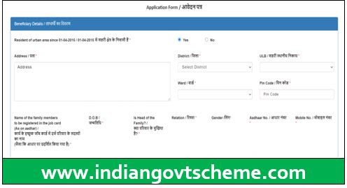 - इसके बाद आपके सामने एक आवेदन पत्र खुल जाएगा जिसमें आपको अपनी सारे जानकारी भरनी है जैसे कि पता, जिला, शहरी स्थानीय निकाय, वार्ड, पिन कोड और घर में जो भी जॉब कार्ड बनवाने के इच्छुक हैं उन सभी सदस्यों की जानकारी जैसे नाम, जन्म तिथि, लिंग, आधार नंबर और मोबाइल नंबर आदि।