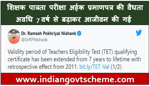 Teachers Eligibility Test Qualifying Certificate Extended from 7 years to lifetime शिक्षक पात्रता परीक्षा अर्हक प्रमाणपत्र की वैधता अवधि 7 वर्ष से बढ़ाकर आजीवन की गई